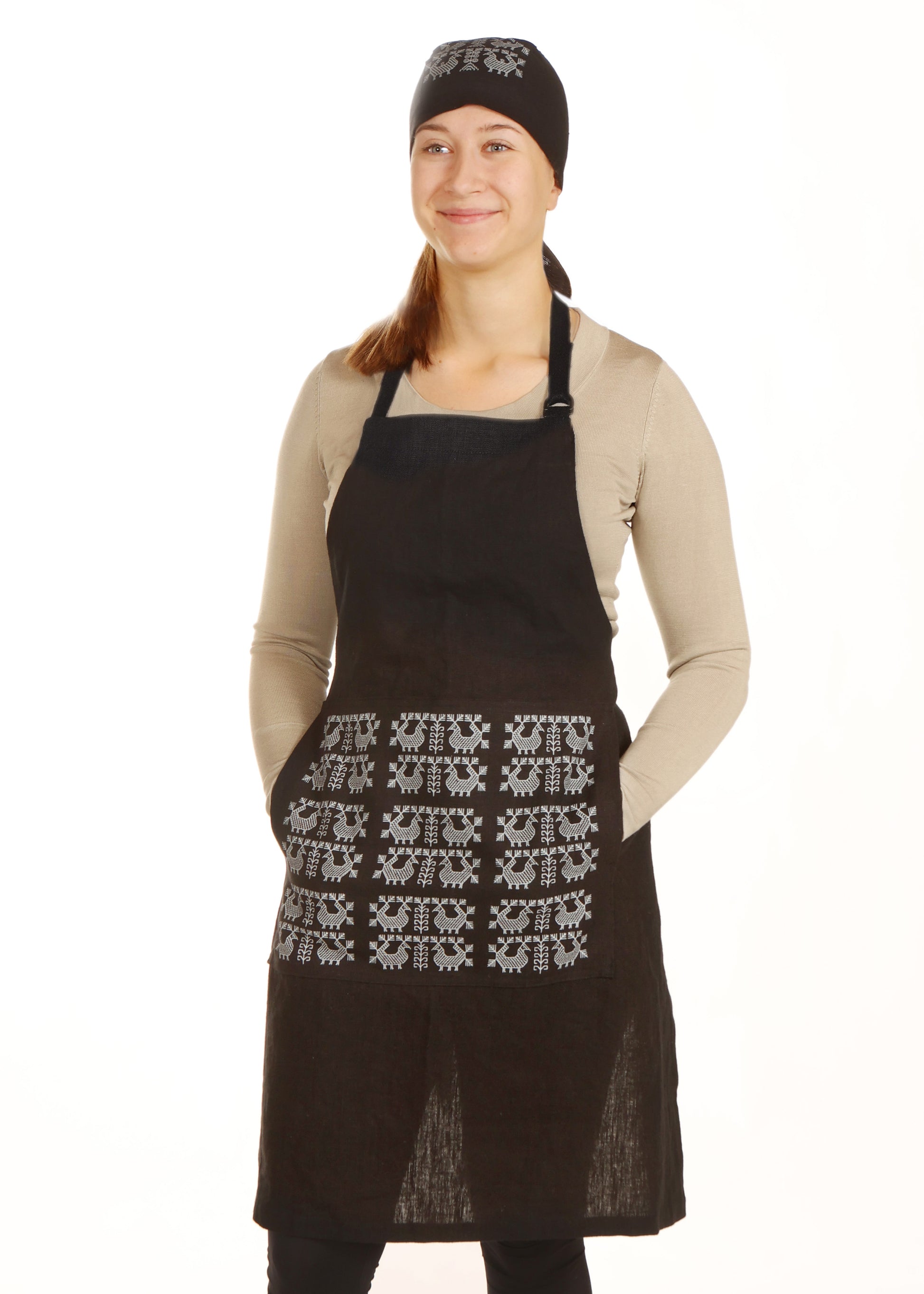 Koita -essu on käytännöllinen. Essussa on iso tasku edessä. Taskunsuut ovat sivussa. Taskussa on käsinpainettu kukkilintukuvio. Niskalenkki on 57 cm ja se on säädettävissä soljella. Vyötärönauhat on 100 cm. Materiaali 100 % pellavaa ja nauhat hamppua. Essu on tehty Itä-Suomessa.