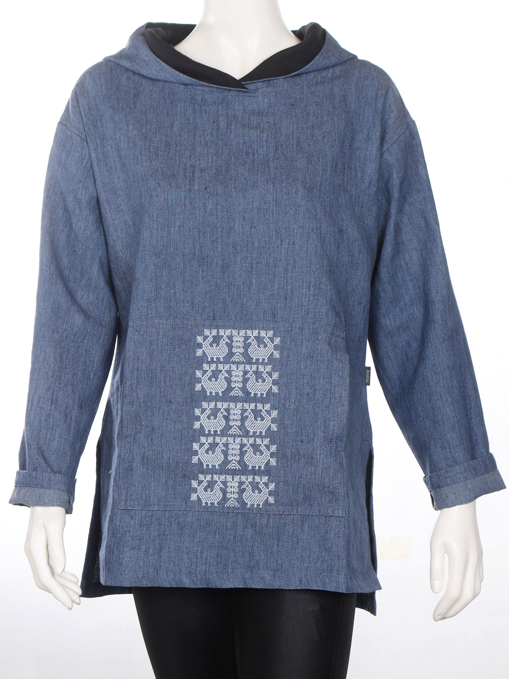 Taskussa on käsin painettu karjalaishenkinen kukkilintukuvio. Hupussa on musta vuori. Huppari on takaa 3 cm pidempi. Huppari on A-mallinen.