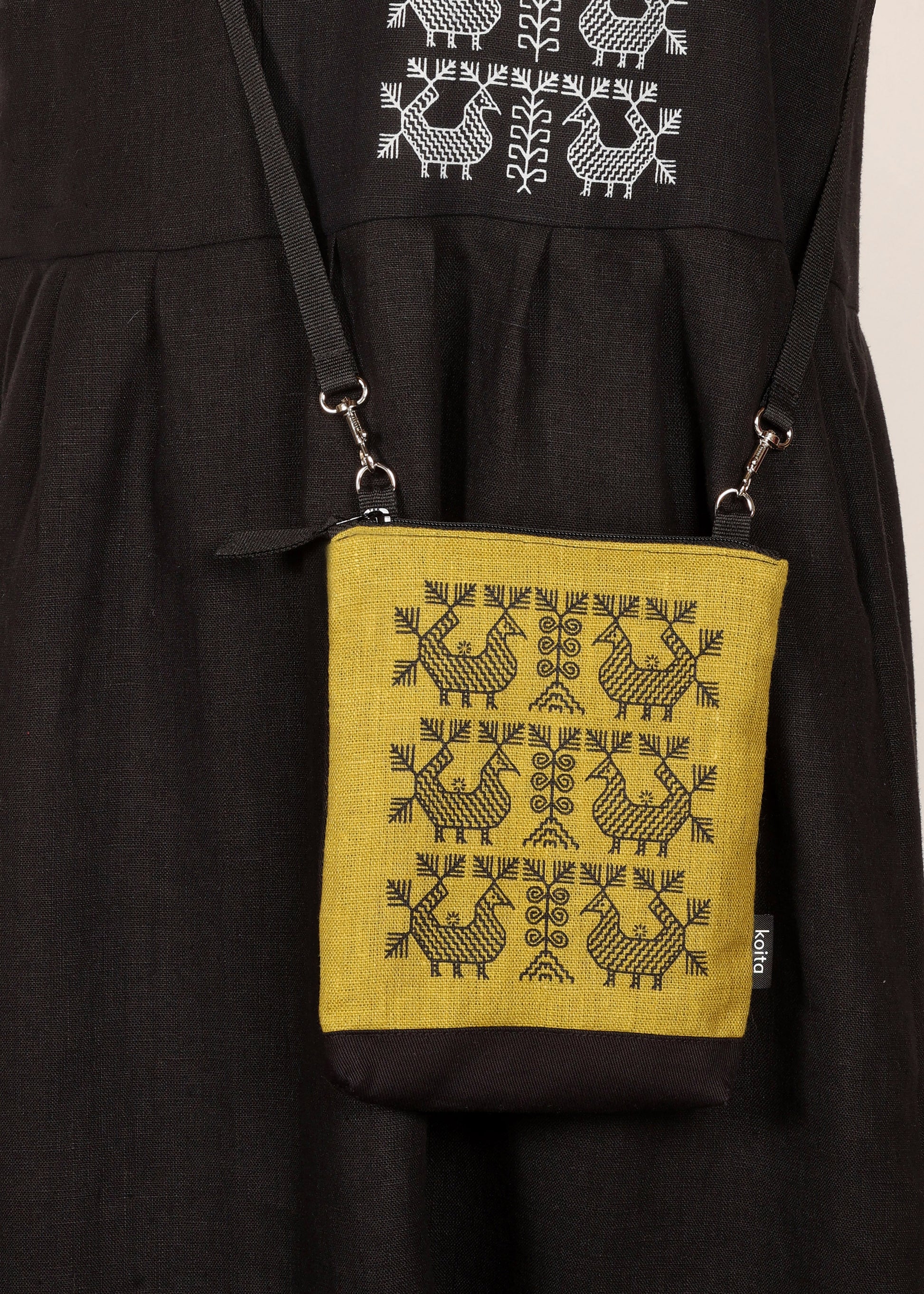 Pellavapussukassa on käsinpainettu kukkilintukuvio. Sisävuori ja taustakangas on mustaa puuvilla/polyesterkangasta. Pussukan korkeus on 19 cm ja pohjan leveys 15 cm. Pussukka on tehty Pohjois-Karjalassa.