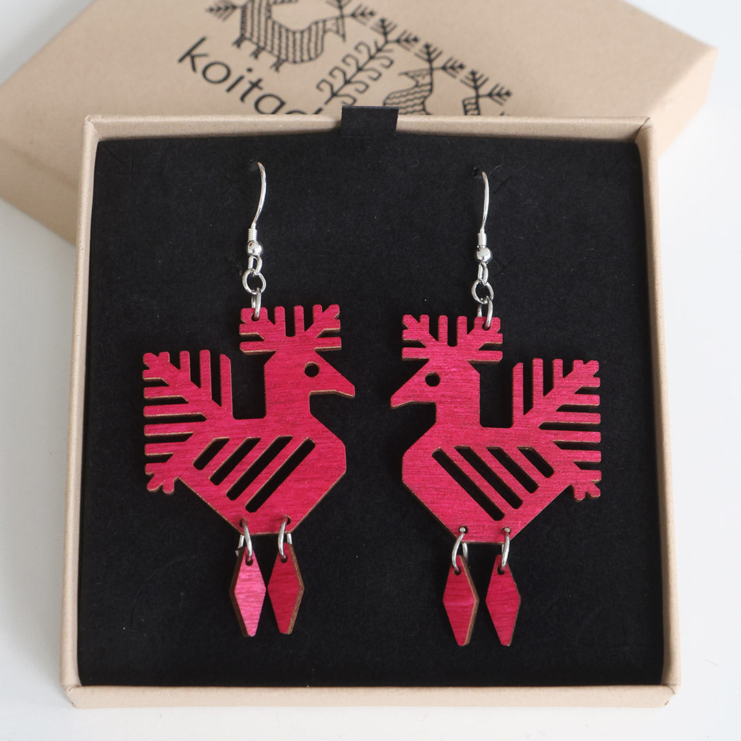 Karjalainen kukkilintu symboloi iloa, valoa ja onnea. Kukkilintu - korvakoru on tehty kotimaisesta koivuvanerista Pohjois-Karjalassa. Koru on 4,5 cm. Koko on koukun kanssa 6,5 cm. Koukku on hopeaa. Mukana on kahdet parit silikonstoppereita. Korut pakataan koitadesign-rasiaan. Mukana myös korun tarina.