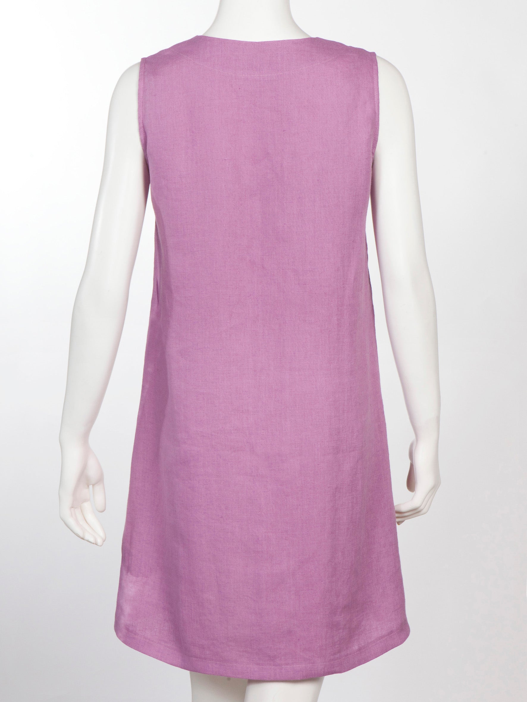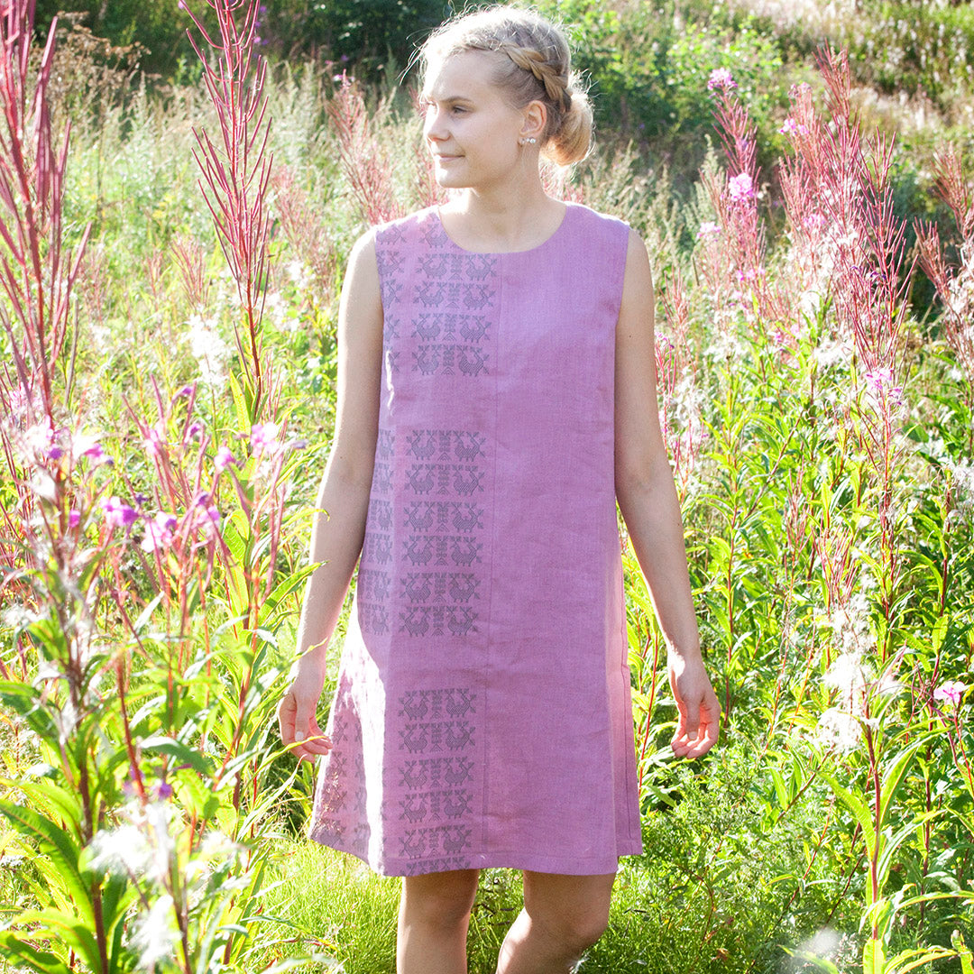 Sara -pellavamekko toimii juhla-, helle- tai liivimekkona paidan päällä. Materiaali on 100 % pellavaa. Käsin painettu kukkilintukuvio on edessä.