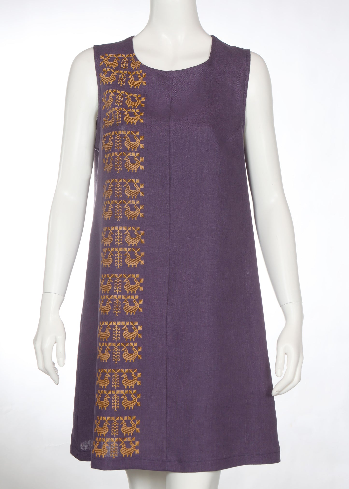 Sara -pellavamekko toimii juhla-, helle- tai liivimekkona paidan päällä. Materiaali on 100 % pellavaa. Käsin painettu kukkilintukuvio on edessä. Huom. Sara violetti valmistuu viikolla 25. Voit tilata omasi etukäteen.