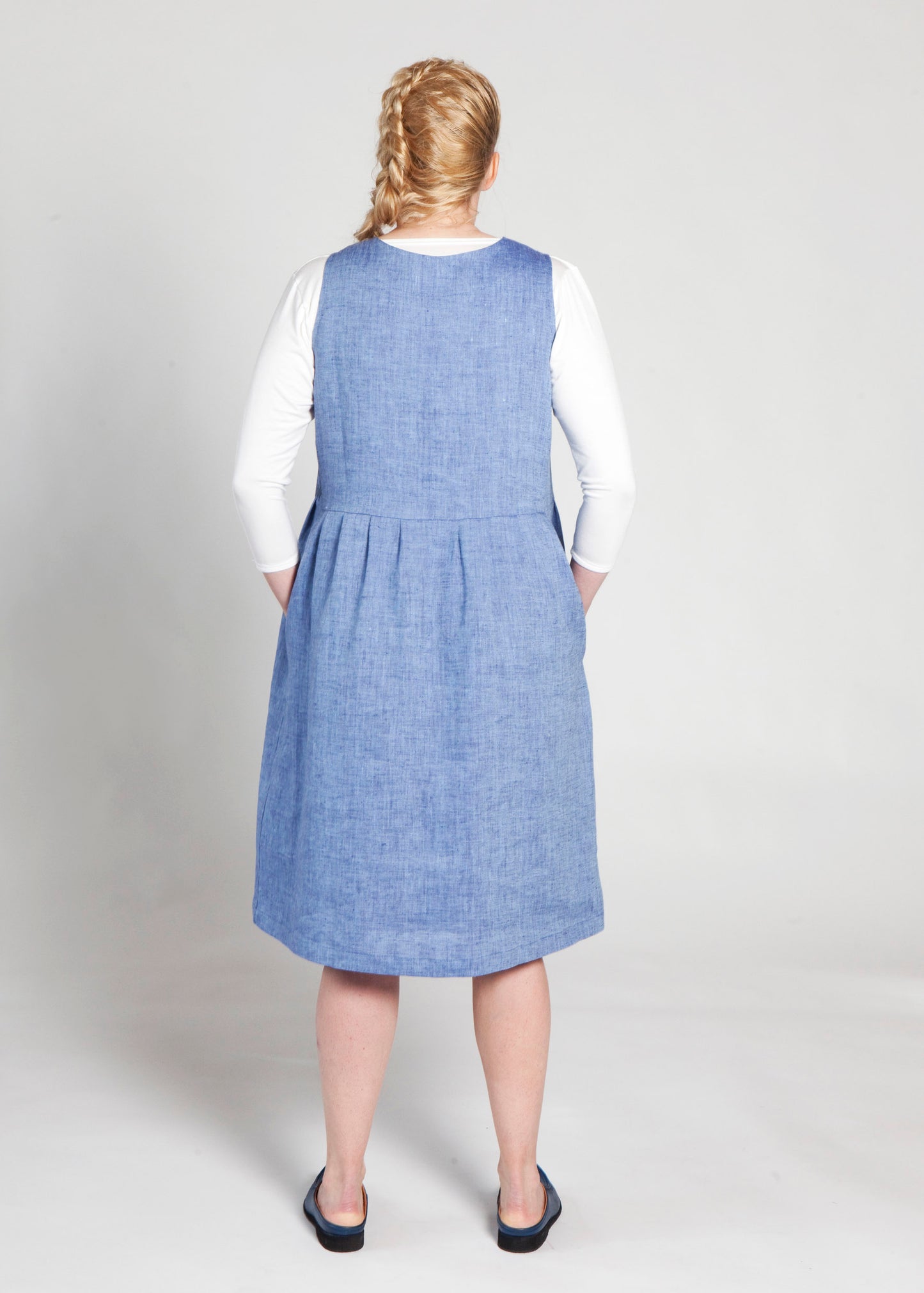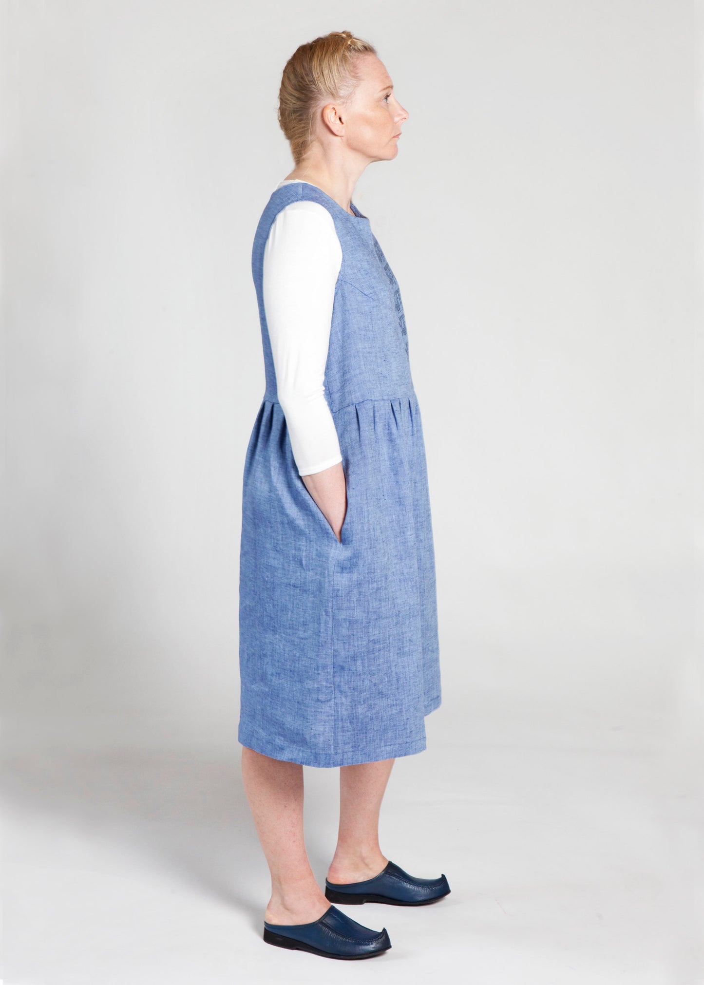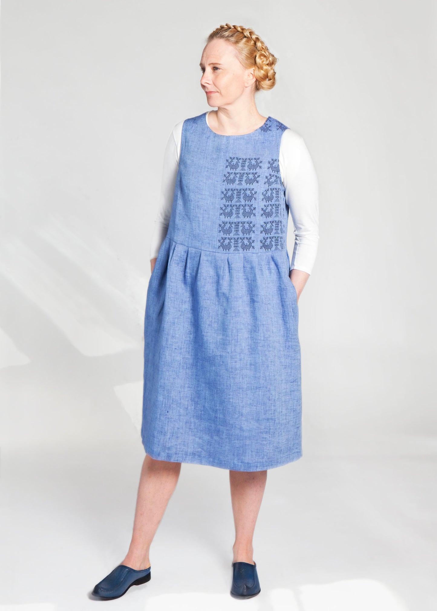 Kotimainen Sarafiina-pellavamekko on käytännöllinen mekko sekä arkeen että juhlaan. Voit käyttää sitä puseron päällä liivimekkona. Se toimii mainiosti myös hihattomana hellemekkona. Sarafiina on tehty 100 % pellavasta. Käsin painettu kukkilintukuvio on edessä. Mekossa on kaksi taskua.